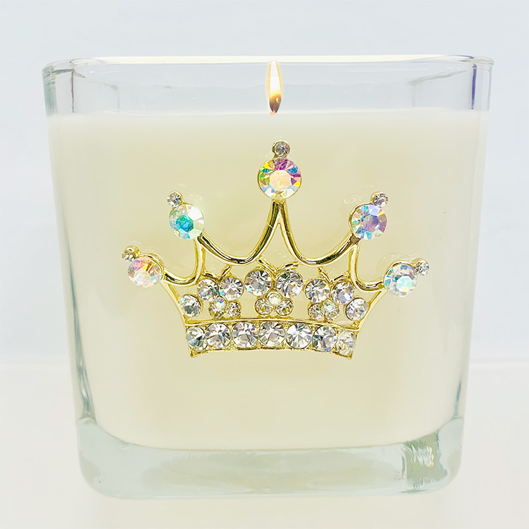 with this glass cube candle adorned with a beautiful, jeweled, gold crown studded with multiple, glistening, iridescent stones. Poured in the popular Biblical scent of King's Garments, it will be a bright and fragrant addition to any setting.